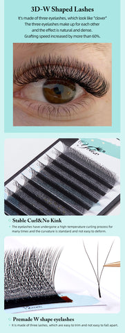 Yelix 0.07 3D-W shaped Auto Fan Eyelash Extensions are designed with triple-leaf clovers, creating fuller and fuller-looking volume. Utilizing a unique design, the Extensions help cut your application time by up to 50%, all while providing superior length and curl retention.