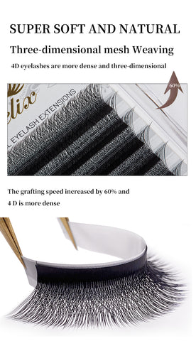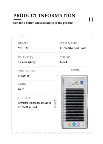 Yelix Lashes 4D W Shaped Eyelash Extensions are the latest advanced development in eyelash technology. Our 4D W Shaped will give your clients luxuriously full, feathery-soft, fluffy, and glamorous, but natural looking sets of eyelashes without damaging their natural lashes!